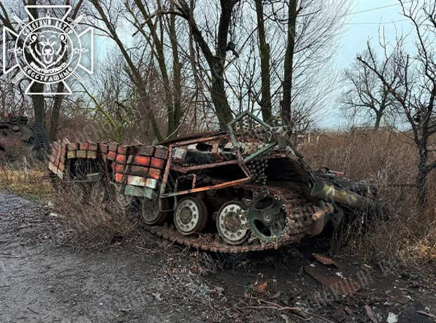 На фотографиях видна разбитая гусеничная машина.Автор публикации обращает внимание на тактический знак на технике — треугольник, который свидетельствует о её принадлежности к одной из украинских оккупационных группировок