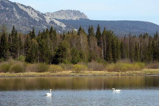 Пара белоснежных лебедей-шипунов прилетела в национальный парк "Таганай", на Старое Тесьминское водохранилище. Задача непростая — выбрать надежное место для постройки гнезда.