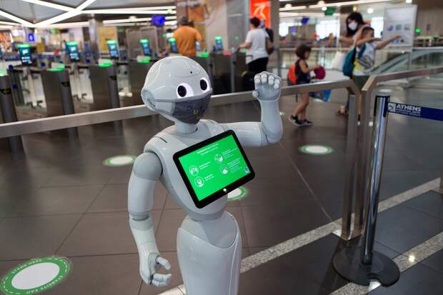 В международном аэропорту греческой столицы о правилах поведения в условиях пандемии прилетающих пассажиров информирует забавный робот. Тоже в маске. Фото: Marios Lolos / Globallookpress