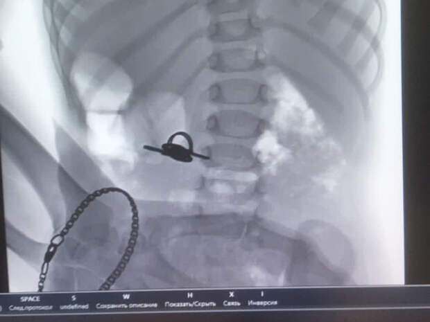 На рентгеновском снимке видно, что в животе малыша они развернулись как вертолётные лопасти. От такого "винта" дискомфорт проявился довольно быстро и ребёнка сразу доставили в больницу. Там врачи-эндоскописты извлекли ключи из желудка. Сейчас здоровью малыша ничего не угрожает.