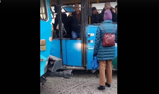 - написали очевидцы ДТП к видео, на котором можно заметить, что бок у автобуса сильно помят, стёкла выбиты, пердняя дверь изувечена и заблокирована, внутри находятся пассажиры.
