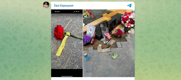 В частности, кто-то оставил пару пакетиков кошачьего корма, жестяную банку и "полторашку" пива, но это далеко не всё. Карицкая нашла на могиле цветок с прикреплённой к нему изолентой с тёмными волосами.