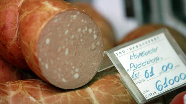 На прилавке магазина колбаса с ценником, на котором старые и новые цены. 8 сентября 1998 г. Фото: Булдаков Олег / ТАСС