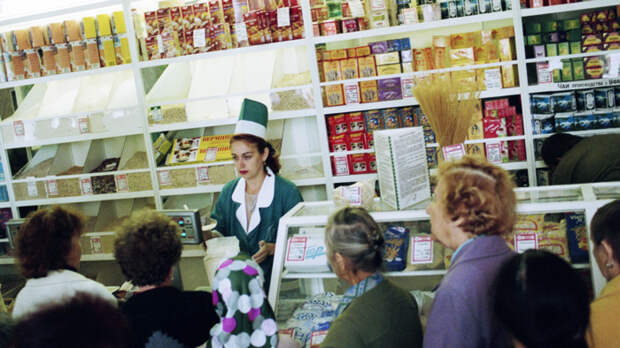 В бакалейном отделе магазина скупают муку, сахар, макароны, крупы. 1998 г. Фото: Рогулин Дмитрий/Фотохроника ТАСС