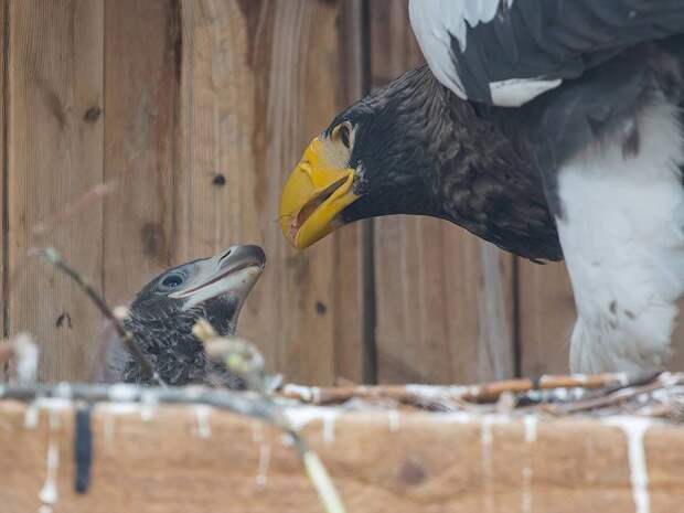 Интересно, что птенца белоплечего орлана в новосибирском зоопарке выкармливает и самец.