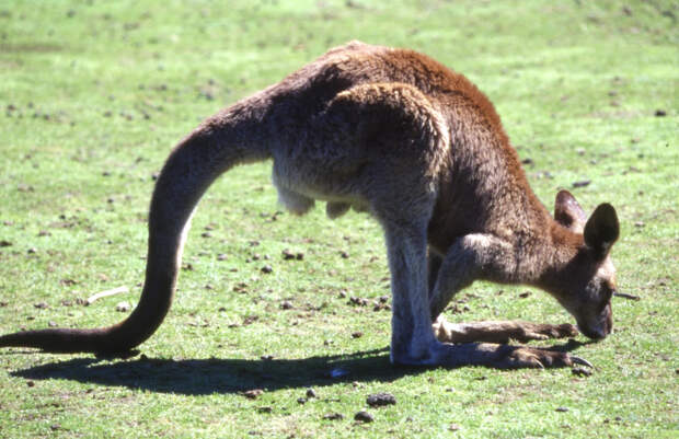 На записи видно, как кенгуру, с характерной для него манерой передвижения, скачет по дороге, а оператор с юмором комментирует его движения.