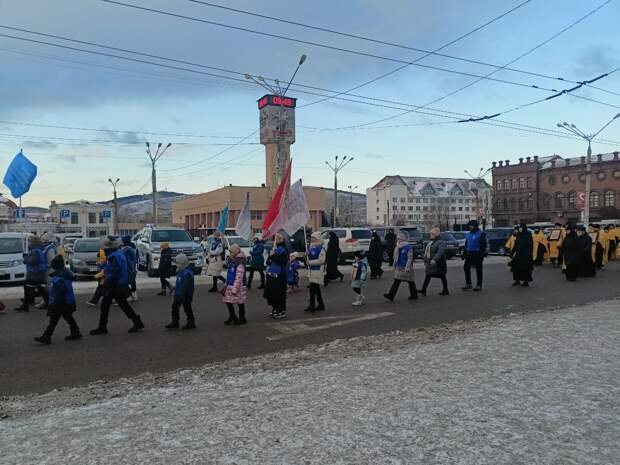 Наши земляки шли вместе с детьми и пожилыми родственниками. Право пронести хоругви предоставили забайкальским военным.