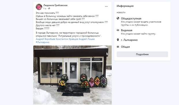 В подмосковном Лыткарино на территории городской больницы открыли магазин ритуальных услуг. Фотографией магазина поделилась местная жительница в сообществе «Наше Лыткарино» в Фейсбуке. На фото изображен небольшой прямоугольный киоск в черных цветах с погребальными венками и металлическими крестами на продажу рядом с входной дверью.