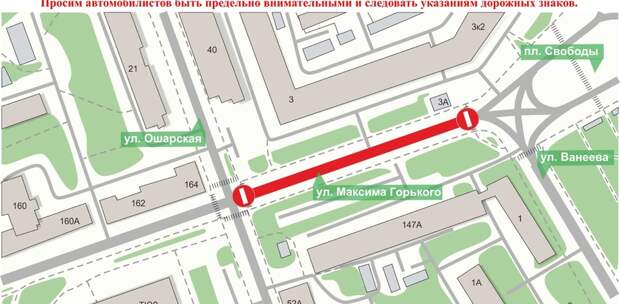 Движение автомобилей и общественного транспорта будет запрещено от перекрёстка с ул. Ошарская до площади Свободы. Автолюбители смогут объехать закрытый участок через улицу Белинского.