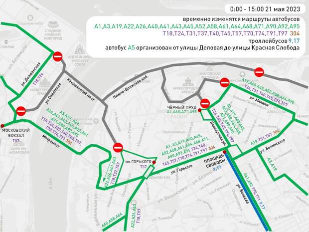 Пискунова и пл. Революции соответственно.Изменения движения коснутся ещё ряда автобусов: А-5, А-1, А-68, А-3, А-61, А-92, Т-70, Т-91, А-19, А-45, А-52, А-90, Т-40, Т-45, А-22, А-26, А-41, А-43, Т-37, Т-57, А-40, А-58, А-64, Т-74, Т-97, А-71, А-95, Т-18, Т-24 и №304. Все они будут объезжать зону в районе Стрелки и Нижневолжской набережной.