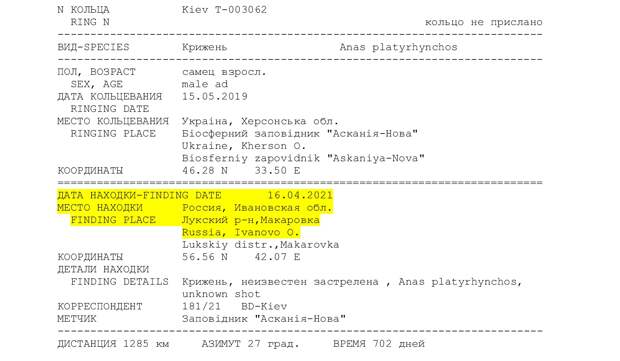 Проводились эксперименты.Представленные на брифинге документы свидетельствуют о том, что в 2021 году из херсонского заповедника «Аскания-Нова» были выпущены окольцованные кряквы. В протоколе отлова птиц указаны места, где их поймали в России. Это Бутурлинский район Воронежской области и, как написано в тексте, «Лукский район, Макаровка» Ивановской области. Указаны и координаты точек, где произведен отлов.