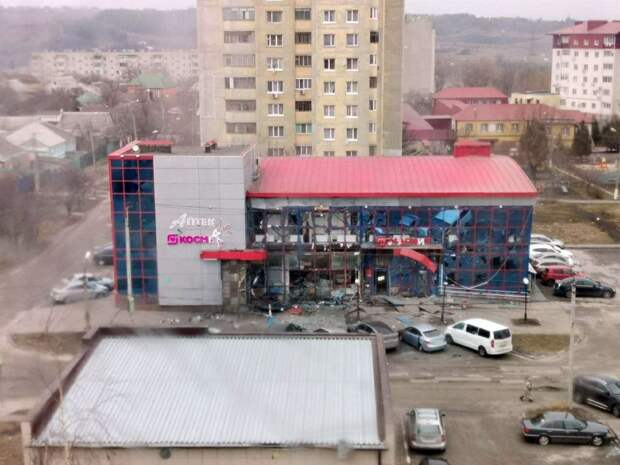 Удар был нанесён по торговому центру на улице Плеханова. При этом осколками посекло и здания поблизости, повреждены автомобили.
