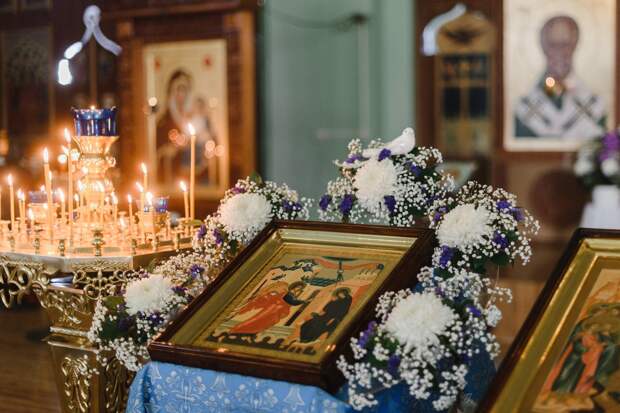 В Благовещение в храмах проходят с утра праздничные богослужения, во время которых священнослужители надевают одежды голубого цвета, потому что этот цвет считается символом Богородицы.