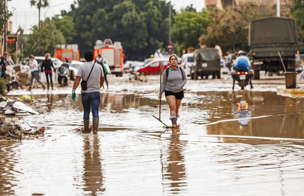 Видео в социальных сетях показывают, как сильные ливни затопили дороги в прибрежных районах Испании. Волонтёры помогают очищать улицы от воды и грязи.