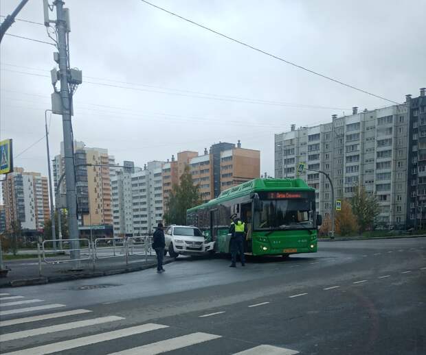 Автобусу с его габаритами нужно было чуть больше места на проезжей части для манёвра, а водитель внедорожника решил, что вполне "проскочит". Но не вышло.Автобус почти впечатал джип в тротуарное ограждение, так что оба оказались в "бутылочном горлышке" и дальше без потерь вырваться у них не получилось.
