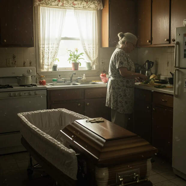 Однако, спустя шесть дней, произошло нечто необъяснимое. Гроб оказался пуст! Паника охватила деревню, пока не выяснилось, что "покойница" преспокойно находится на кухне, готовя себе еду.