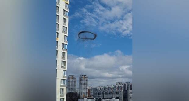 Жители Москвы сняли в небе над Строгино кольцо из черного дыма, которое образовалось после хлопка. Кадры очевидцы опубликовали в социальных сетях.