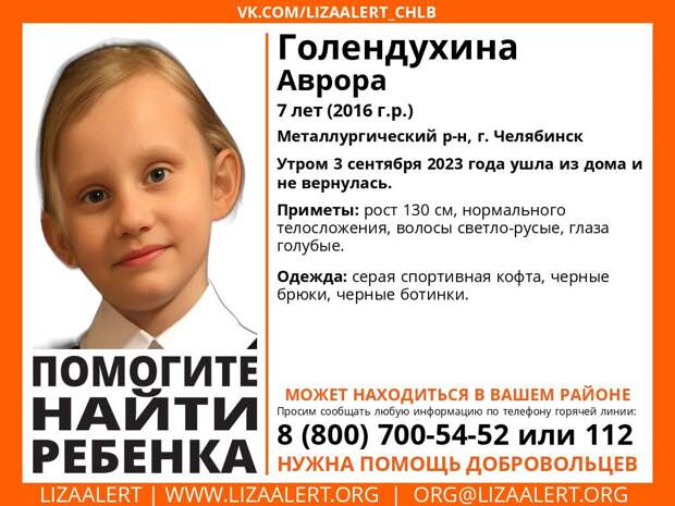 В Металлургическом районе Челябинска пропала 7-летняя Аврора Голендухина. Девочка ушла из дома утром 3 сентября и до сих пор не вернулась, сообщили в поисковом отряде "ЛизаАлерт" Челябинской области.