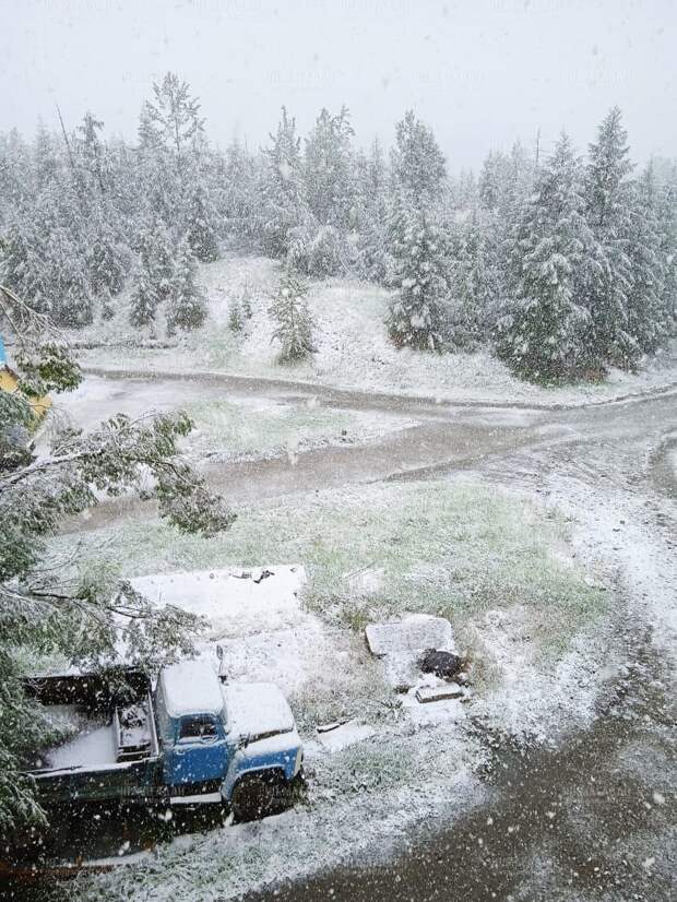 В центральных районах Магаданской области в понедельник выпал снег сразу после долго продержавшейся сорокоградусной жары.