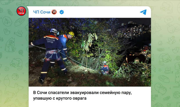 В ночь на 8 декабря в курортном городе Сочи произошёл инцидент, потребовавший вмешательства спасателей. Семейная пара, совершавшая прогулку, сорвалась с крутого обрывистого склона и оказалась в западне — в глубоком овраге, заросшем густыми и колючими кустарниками. Самостоятельно выбраться из сложного природного капкана мужчина и женщина не смогли.