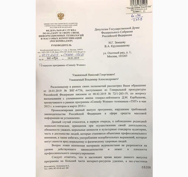 До тех пор, пока они не устранят нарушения, которые, на мой взгляд, существуют. Прошло уже больше шести лет! - отметила Иванова. - Это видео продолжает гулять по интернету, и до сих пор никто не дал оценку. Значит, наше мировоззрение и мировоззрение нашей молодежи атрофировалось и привыкло к такой пошлости и оскорблением. Уже никто не замечает важных посылов. Нас хотят превратить просто в каких-то манкуртов, которые не помнят ни своей истории, ни своего родства. Это не так. Мы потомки великих русских людей".Параллельно с этим депутаты Государственной Думы Николай Земцов и Владимир Крупенников направили официальный запрос в Роскомнадзор, с тем, чтобы разобраться, насколько такого рода программы соответствуют российскому законодательству. Ответ за подписью руководителя службы Александра Жарова, мягко говоря, вводит в ступор: