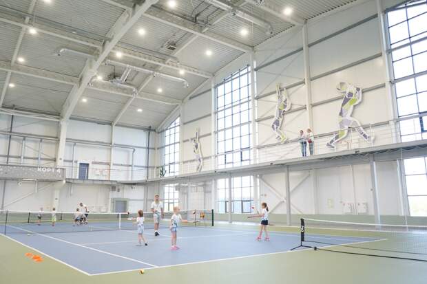 Новый спорткомплекс расположился в двухэтажном здании площадью 8 000 квадратных метров. Он может одновременно принять более сотни любителей тенниса и активного образа жизни. На первом этаже – спортплощадка с четырьмя теннисными кортами и полями для занятий волейболом и мини-футболом.