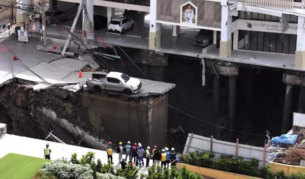 Проезжая часть одной из оживленных улиц в Бангкоке обрушилась на глубину 50 метров. Очевидцы успели запечатлеть последствия ЧП.
