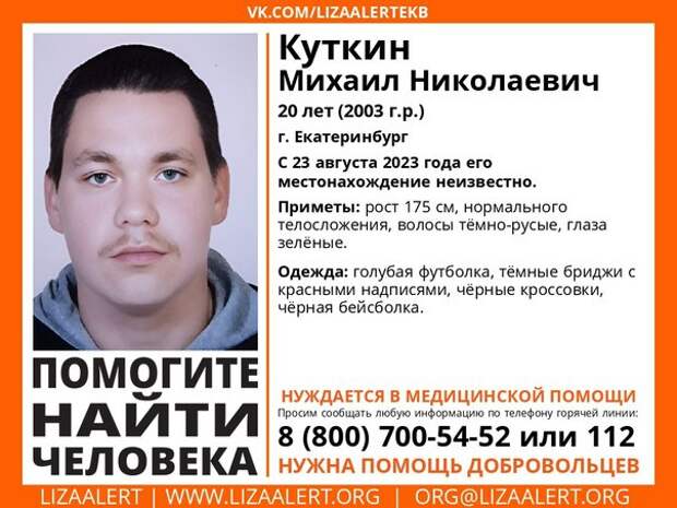 В Екатеинбурге волонтеры и полиция разыскивают 20-летнего Михаила Куткина. По данным спасателей, парень нуждается в медицинской помощи.