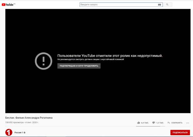 И интернет-платформа "Гугла" маркировала "Беслан" так: "Этот контент помечен YouTube как несоответствующий (правде) и агрессивный".