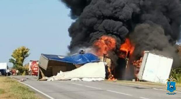 На 61-м километре МАЗ, который вёз муку, выехал на встречную полосу и врезался в Daf. По касательной одна из фур задела бензовоз. После столкновения вспыхнула кабина МАЗа. Водитель получил травму ноги. Его передали медикам. Предварительно, у МАЗа сломалось колесо.— После тушения будет организовано реверсивное движение. Сейчас дорога перекрыта, — добавили в полиции.