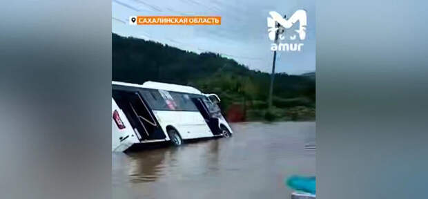 Очевидцы сообщают о том, что на затопленной дороге на Сахалине перевернулся автобус с пассажирами. Это произошло после того, как река Казачка вышла из берегов.